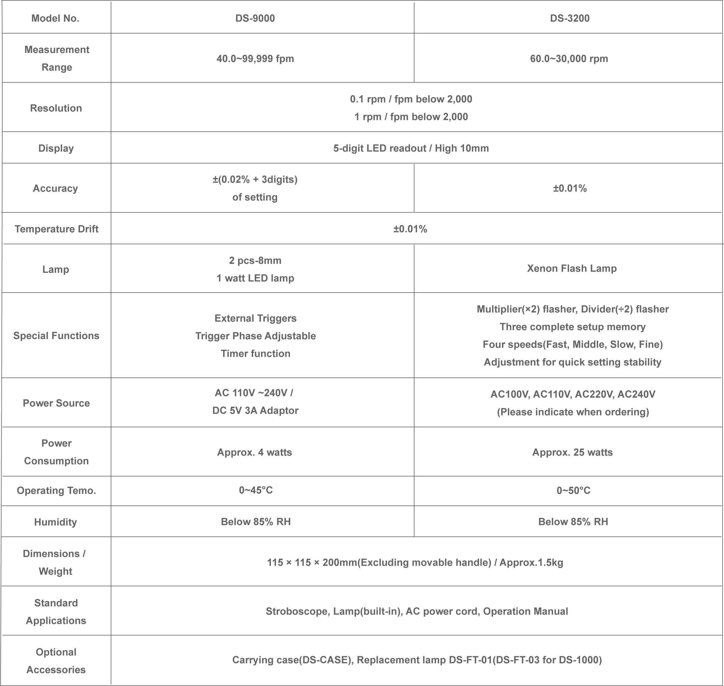 - Timer function: 1, 5, 10 minutes or sustained (DS-9000 only)